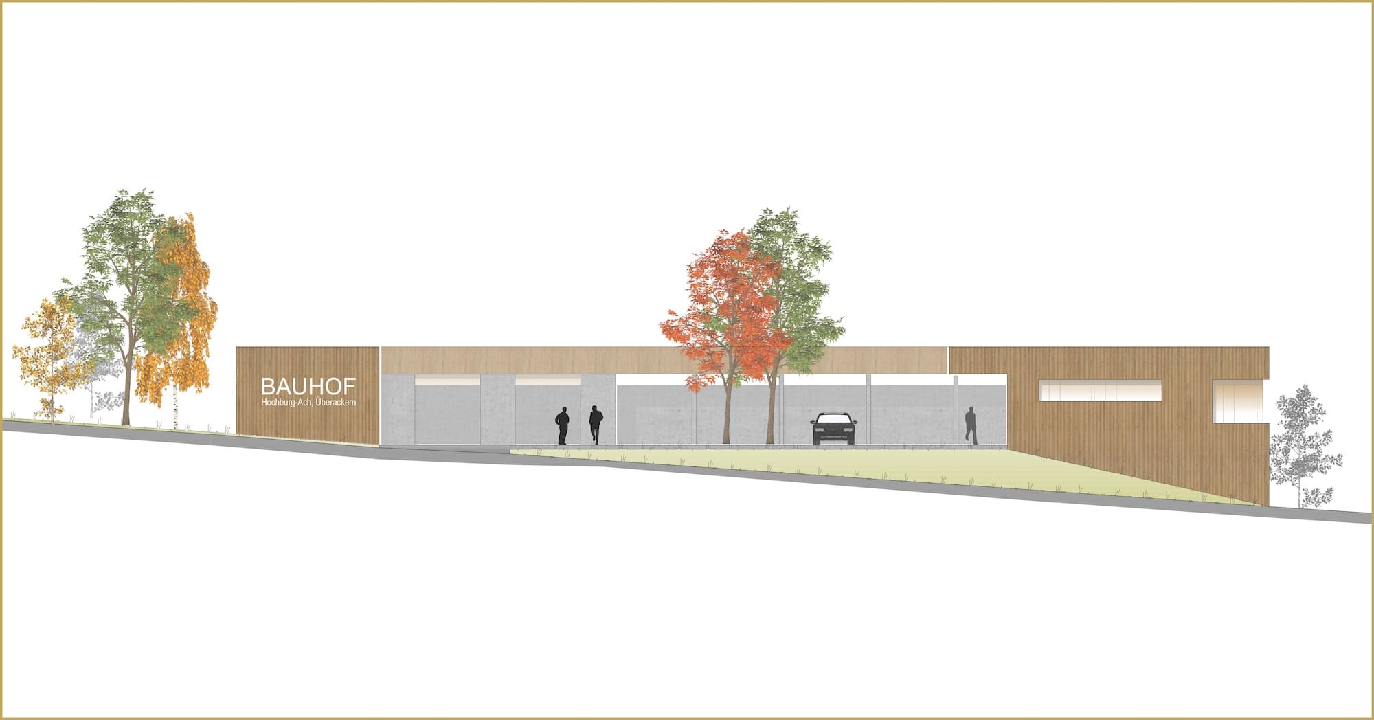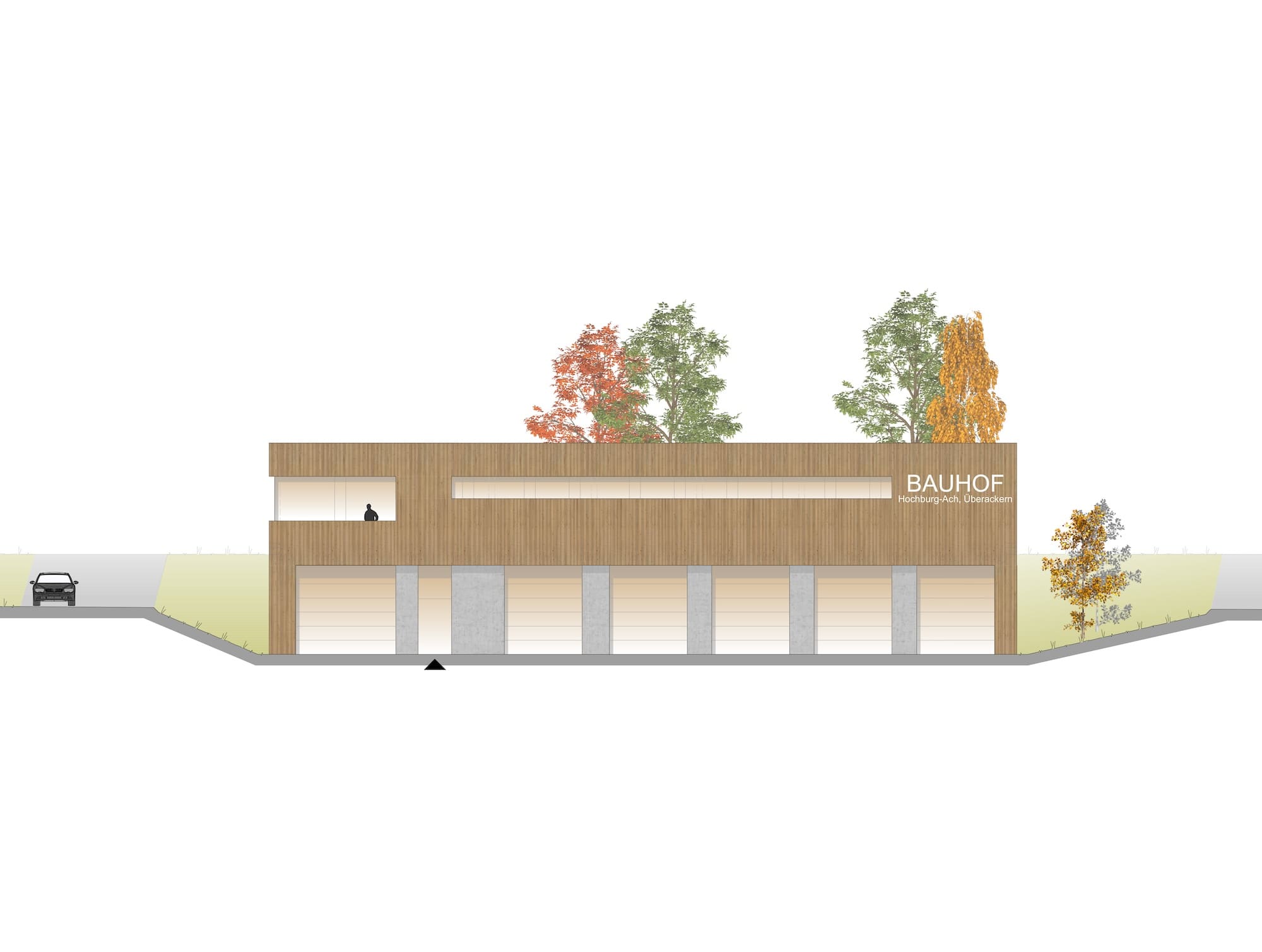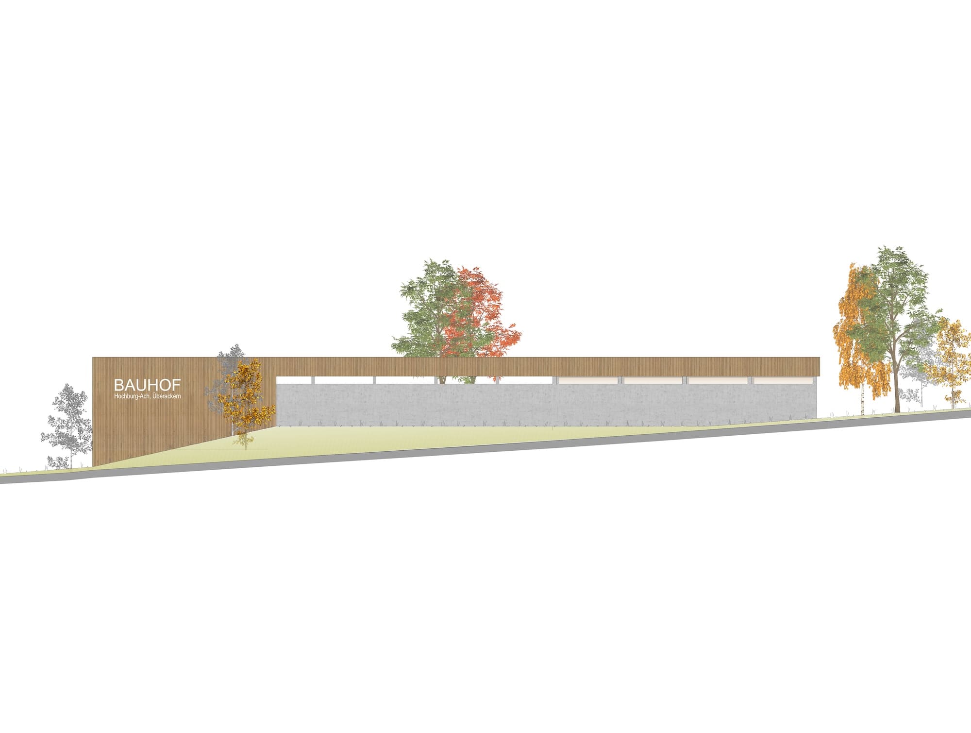 Die beiden Gemeinden Hochburg-Ach und Überackern möchten ihre kommunale Infrastruktur durch einen gemeinsamen und zeitgemäß ausgestatteten Bauhof erweitern. Durch die topographische Gegebenheit des Grundstücks, von Süden Richtung Norden zur Straße hin über 6m abfallend, bietet es sich an, ein zweigeschossiges Gebäude so in das Grundstück zu platzieren, dass sowohl die obere als auch die untere Etage ebenerdig erschlossen werden kann.