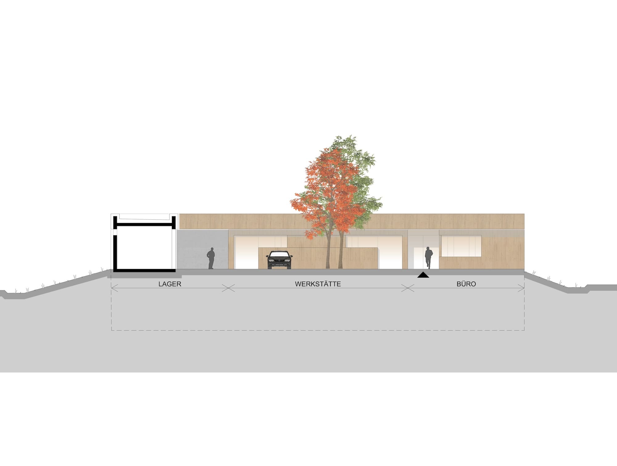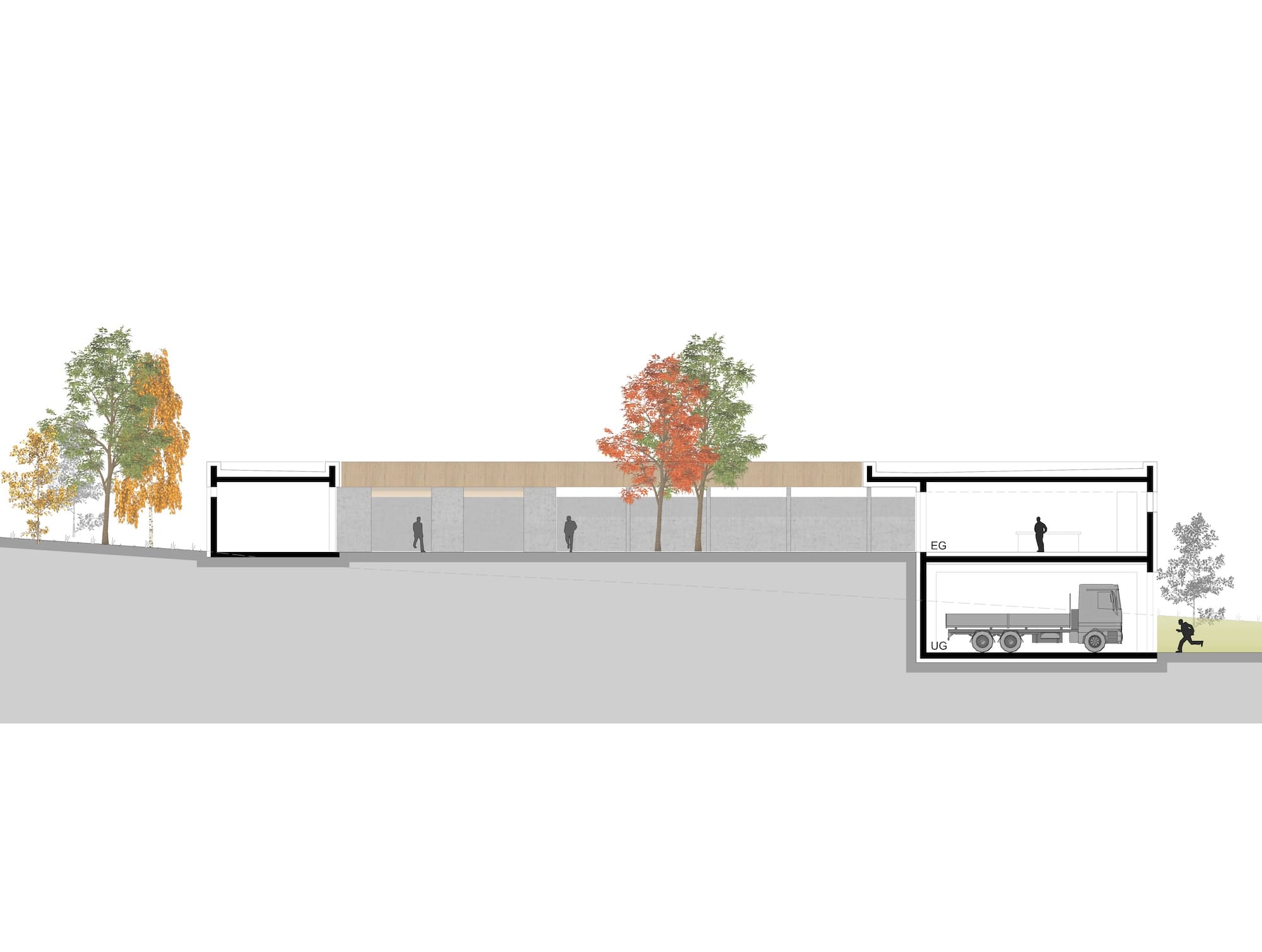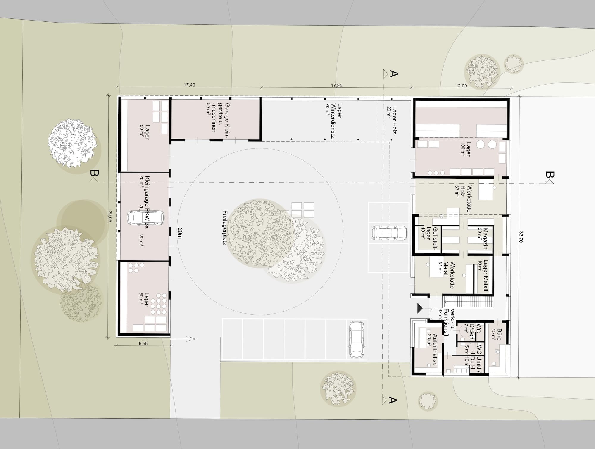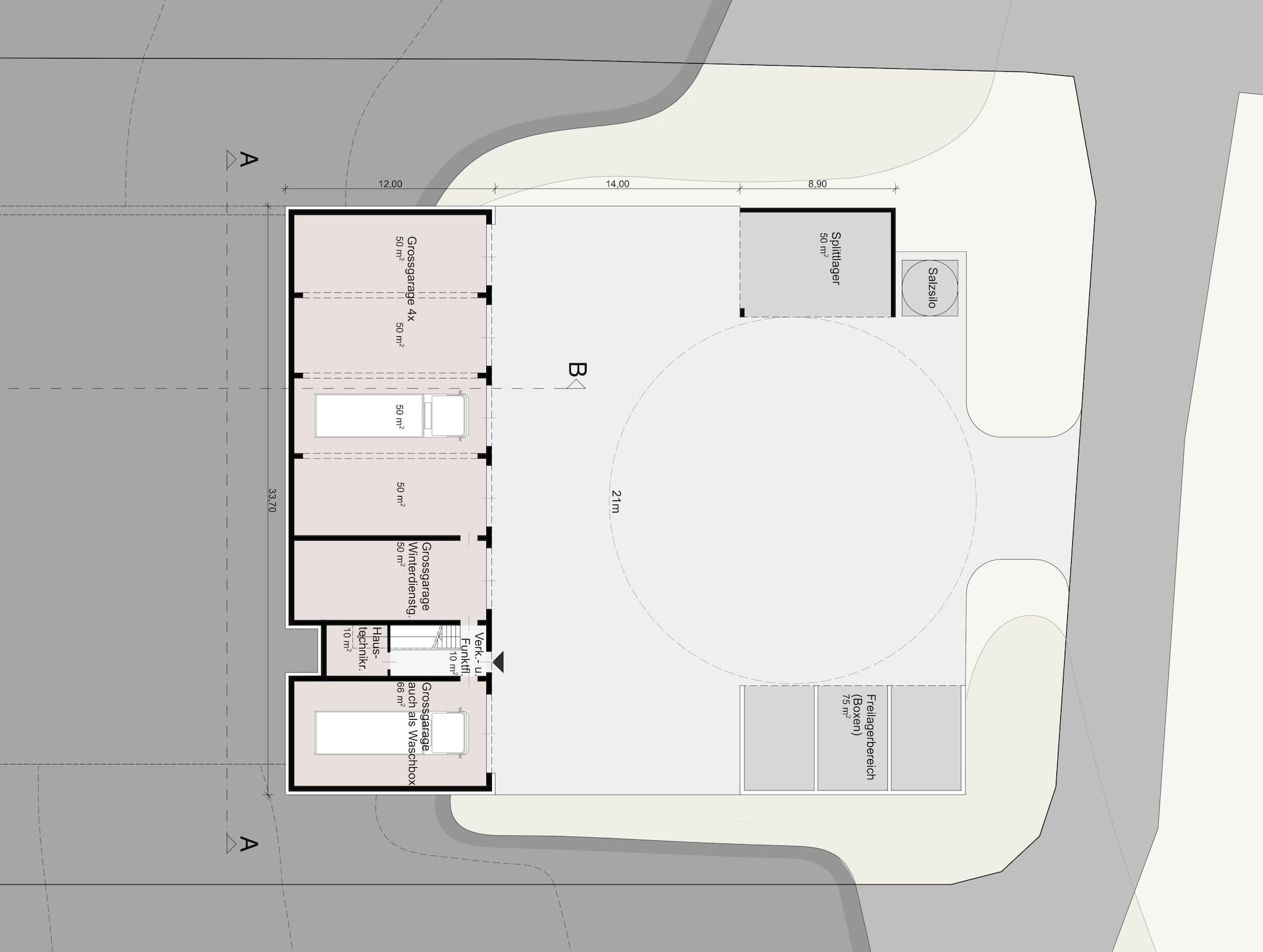 Die beiden Gemeinden Hochburg-Ach und Überackern möchten ihre kommunale Infrastruktur durch einen gemeinsamen und zeitgemäß ausgestatteten Bauhof erweitern. Durch die topographische Gegebenheit des Grundstücks, von Süden Richtung Norden zur Straße hin über 6m abfallend, bietet es sich an, ein zweigeschossiges Gebäude so in das Grundstück zu platzieren, dass sowohl die obere als auch die untere Etage ebenerdig erschlossen werden kann.